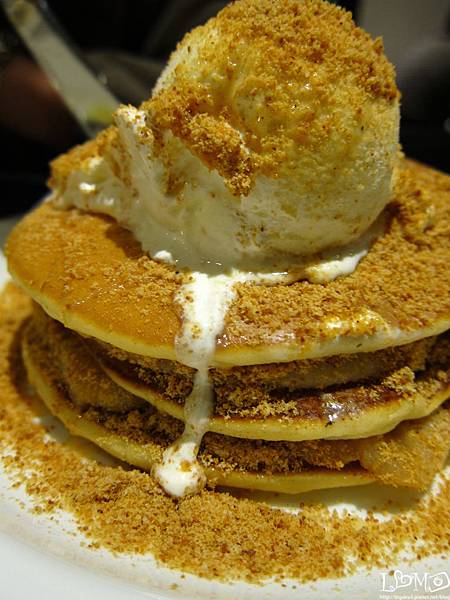 最後在高聳的煎餅山上,放上致命的一球香草冰淇淋