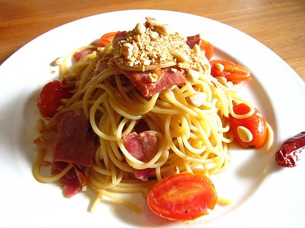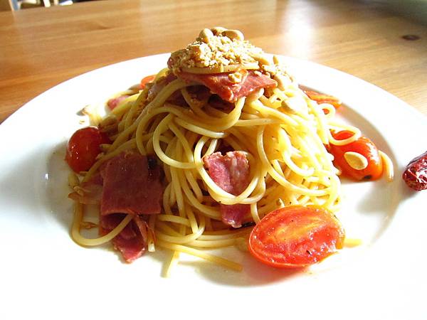 蒜味搭配培根香氣十足,培根略油,但吃口番茄就可以解膩,搭配蠻特別的
